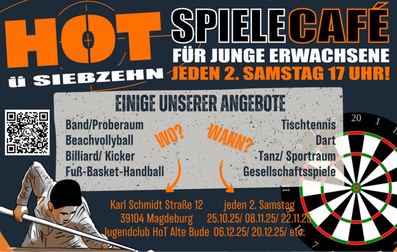 ... ist unser Angebot für junge erwachsene MagdeburgerInnen zum chilligen Treff mit Spörtchen und Spielchen und ohne große Kosten! Also: Nachbarn, Azubis, Studies, Bürger! Schaut gern rein und habt (i.d.R.) jeden zweiten Samstagnachmittag eine entspannte Zeit im HOT! Immer aktuelle Infos hierzu findet Ihr in dieser WhatsApp-Gruppe!